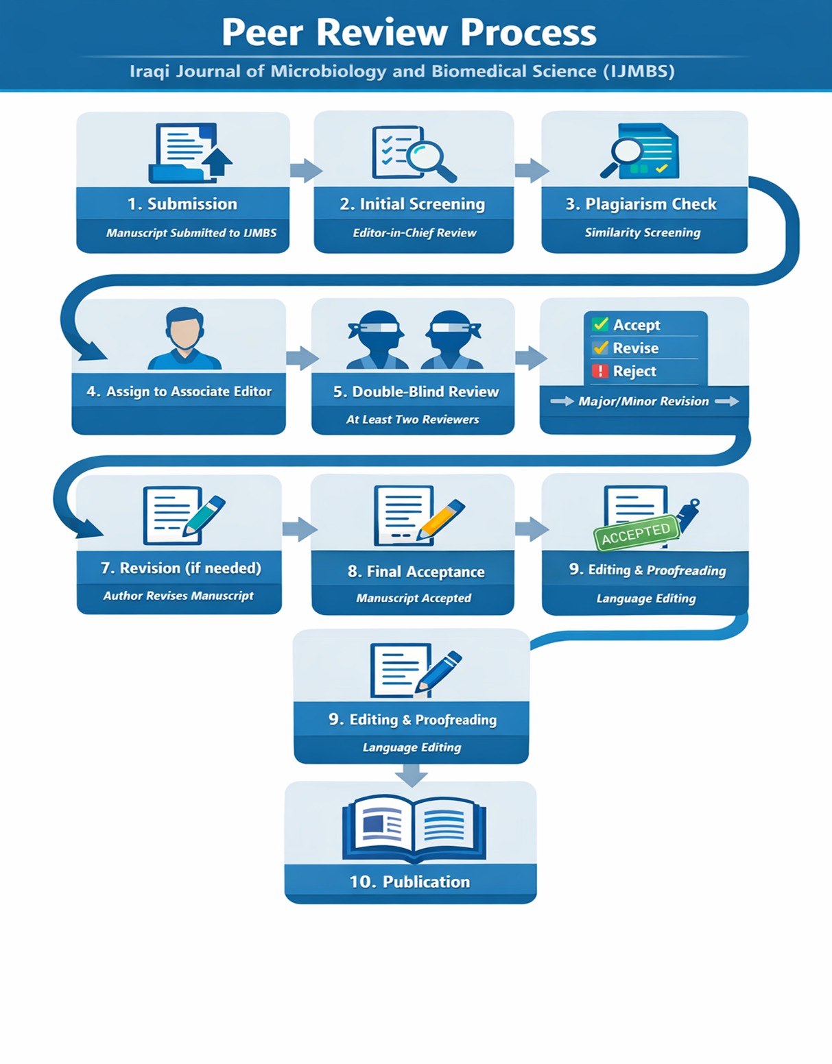 All manuscripts submitted to the Iraqi Journal of Microbiology and Biomedical Science (IJMBS) are subject to a rigorous double-blind peer review process, in which the identities of both authors and reviewers are kept confidential.